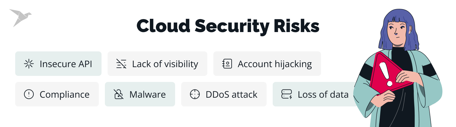 The most common security risks of cloud computing are limited visibility into network operations, insecure integration and APIs, data loss, data breach, DDoS attacks, account hijacking, compliance, and malware.