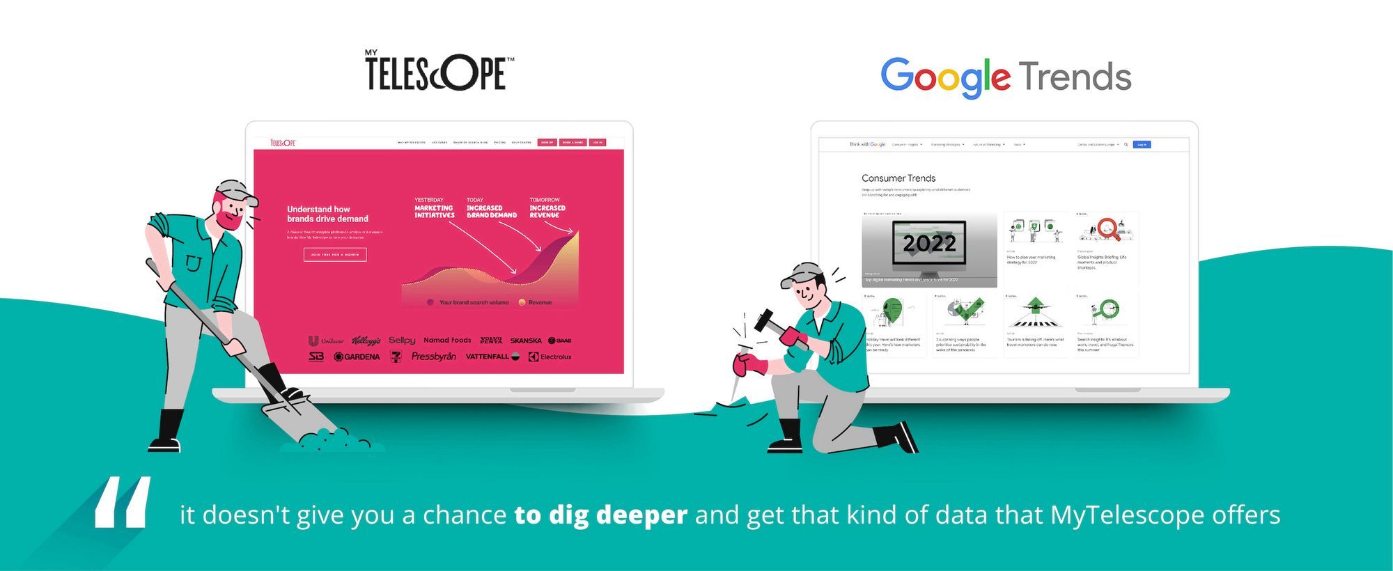 Another vast and powerful competitor is Google Trends. First of all, it is free. In the second — it's mega-popular and authoritative. However, it doesn't give you a chance to dig deeper and get that kind of data that MyTelescope offers.