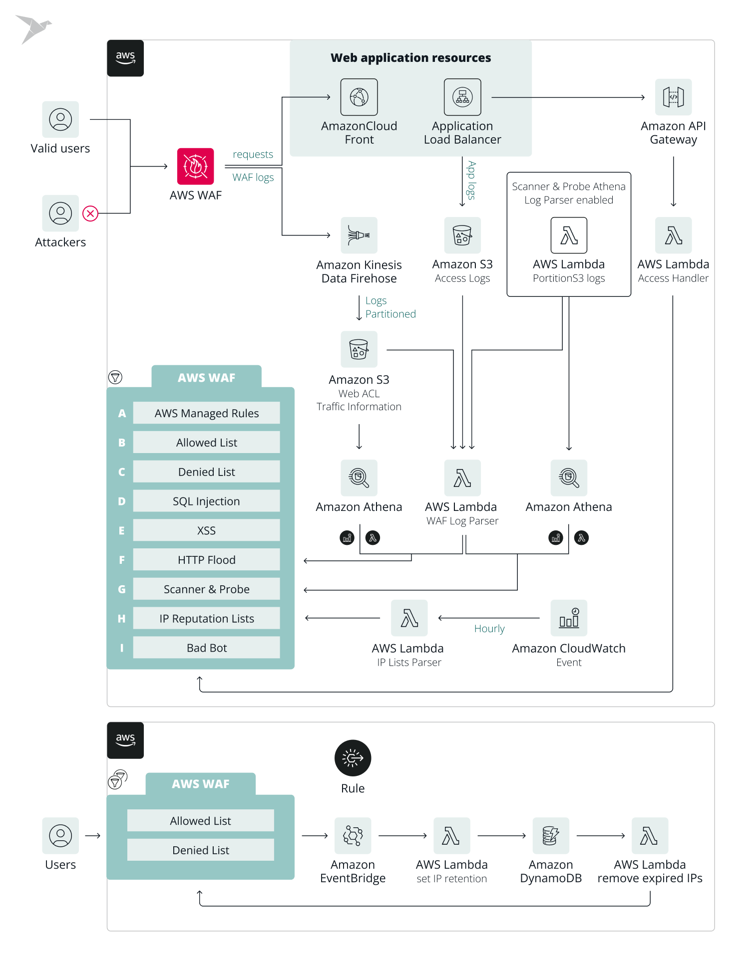 Security Automations for AWS WAF solution comprises various components that not only block malicious traffic but also analyze it and take actions based on the analysis. It helps us prevent common attacks like XSS and SQL injection, analyze logs for repeated 400 response codes from a single IP, and use threat intelligence to block known malicious IPs.