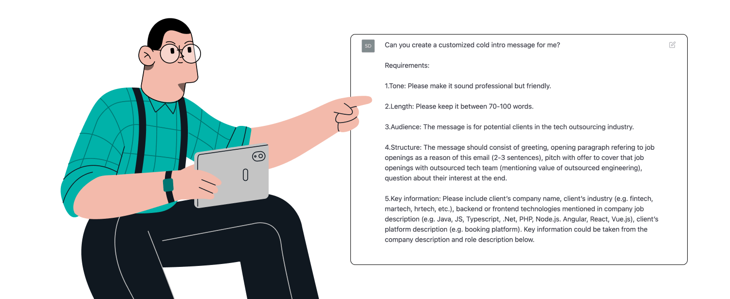 - Consistency and analysis: Unlike personalised intro messages, ChatGPT-generated message templates are consistent, making it easier to analyse which message tone or call-to-action (CTA) gives the best response rate. It allows you to generate a different tone and other variations of elements for the template (opening sentence, CTA, prop value). These variants can be A/B tested to see what works best.