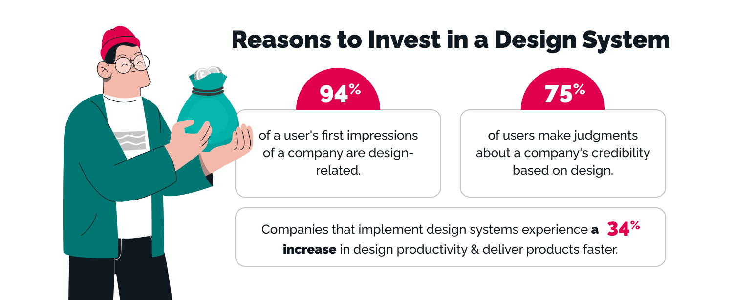 The business value of design systems is undeniable. A study by Kinesis Inc. revealed that 94% of a user's first impressions of a company are design-related, and 75% judge a company's credibility based on design.