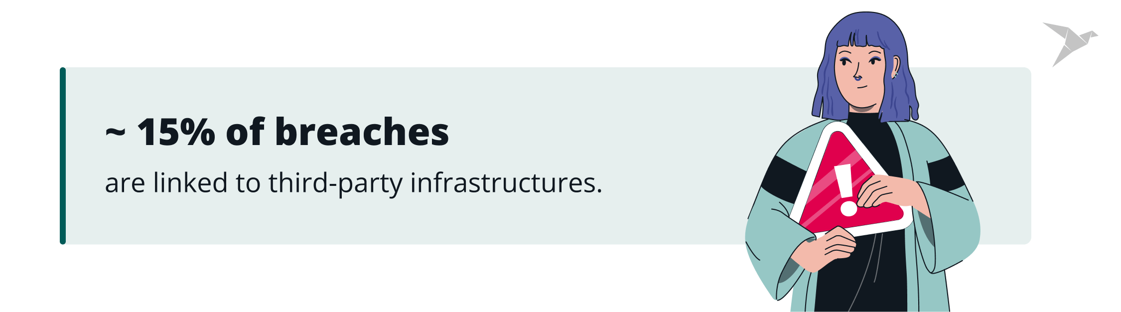 A 2024 Verizon Data Breach Investigations Report revealed that approximately 15% of breaches were linked to third-party infrastructures, such as software supply chains, hosting partner infrastructures, or data custodians. This marks a 68% increase from 2023.