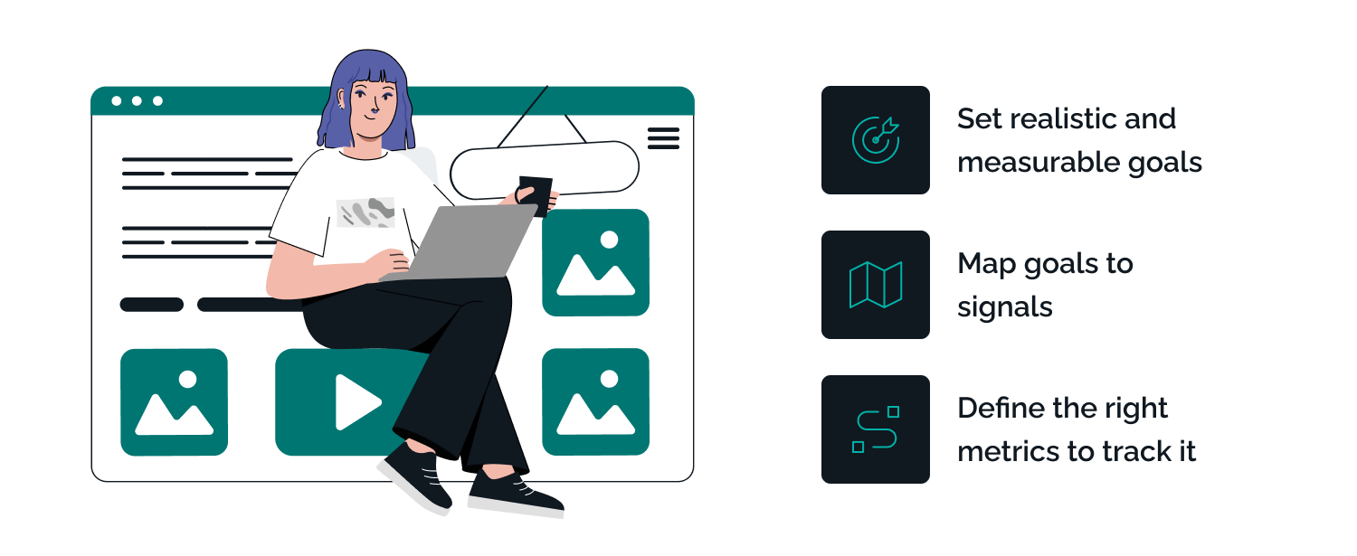 Every goal is related to user actions. Mapping your goals to those actions can let you know whether you’re on track. Similarly, signals must be determined based on the goals. What behaviors or attitudes would indicate your goal has been met or failed?