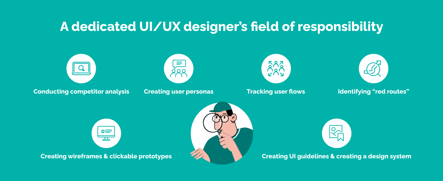 Suppose you hire a dedicated web designer. What is their field of responsibility? The short answer is that they will perform all the tasks an in-house designer would do within a particular project. The exact list of such tasks will depend on the specifics of your request and design needs. But some common UI/UX designer’s responsibilities include: