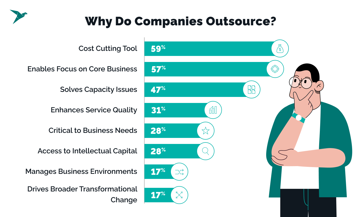 70% of businesses seek to outsource services to save money. Despite being crucial to company goals, 59% of outsourcers say that an outsourcing strategy is primarily implemented to reduce costs.