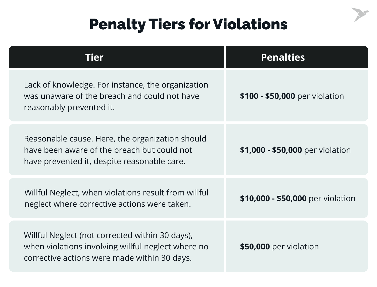 Example: A healthcare provider doesn’t notify patients of a breach of stolen medical records within the 60-day timeframe. That’s a deliberate violation of HIPAA and will cost you big time.