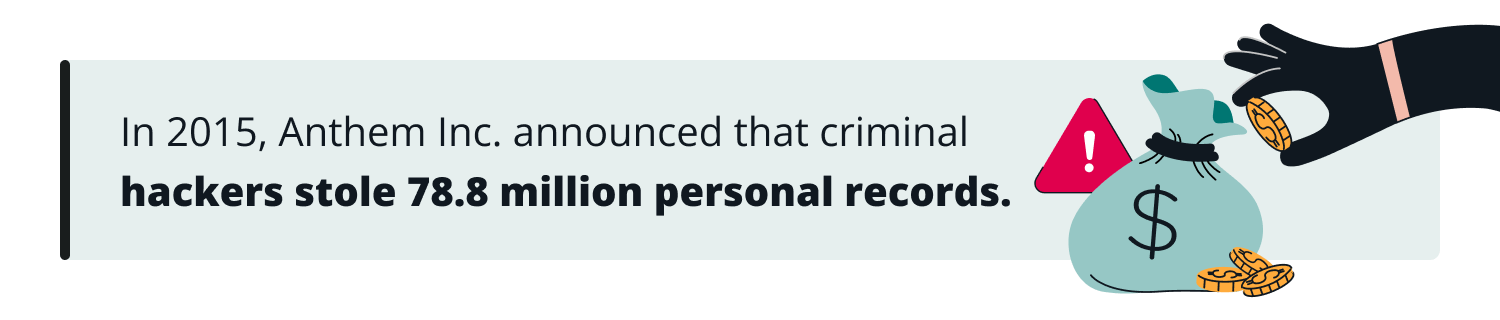 In 2015, Anthem Inc. (now Elevance Health) was hacked. On February 4, they announced that criminal hackers had gotten into their system and potentially stole 37.5 million personal records. By the end of the month, that number grew to 78.8 million people. Hackers got names, birthdates, social security numbers, electronic mail addresses, and employment info across multiple Anthem brands, including Blue Cross and Blue Shield.