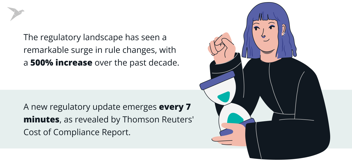 The regulatory landscape has seen a remarkable surge in rule changes, with a 500% increase over the past decade. A new regulatory update emerges every 7 minutes, as revealed by Thomson Reuters' Cost of Compliance Report.