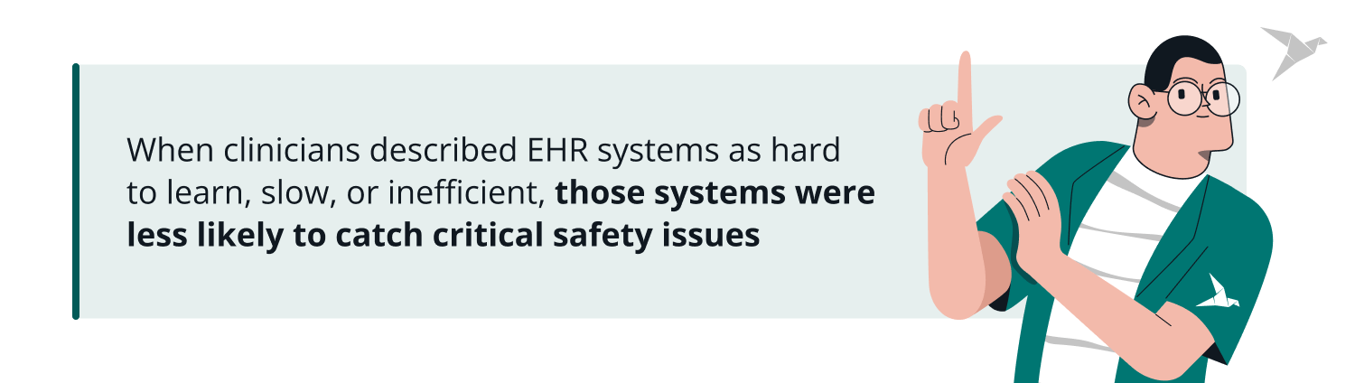 For instance, a study published in JAMA Network Open examined Electronic Health Record (EHR) systems in 112 U.S. hospitals, comparing safety data with survey responses from more than 5,600 clinicians. The findings were clear. When clinicians described EHR systems as hard to learn, slow, or inefficient, those systems were less likely to catch critical safety issues such as drug interactions, patient allergies, or duplicate orders.