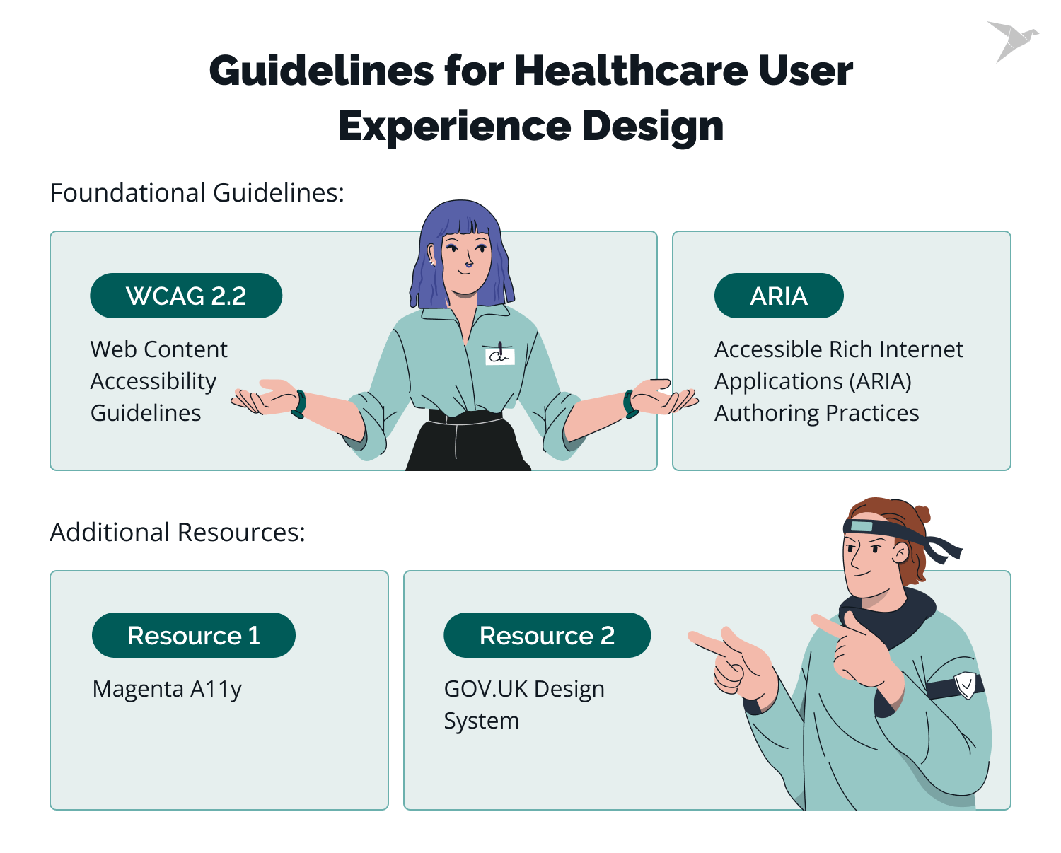 The Web Content Accessibility Guidelines (WCAG) 2.2 are essential for making web content accessible to people with disabilities. Healthcare products should follow these guidelines to ensure text is readable, images have alternatives, and users can navigate and interact without barriers. Additionally, using ARIA (Accessible Rich Internet Applications) helps make interactive elements accessible for screen readers and other assistive technologies. These guidelines help healthcare UX designers create more intuitive and inclusive experiences for users.