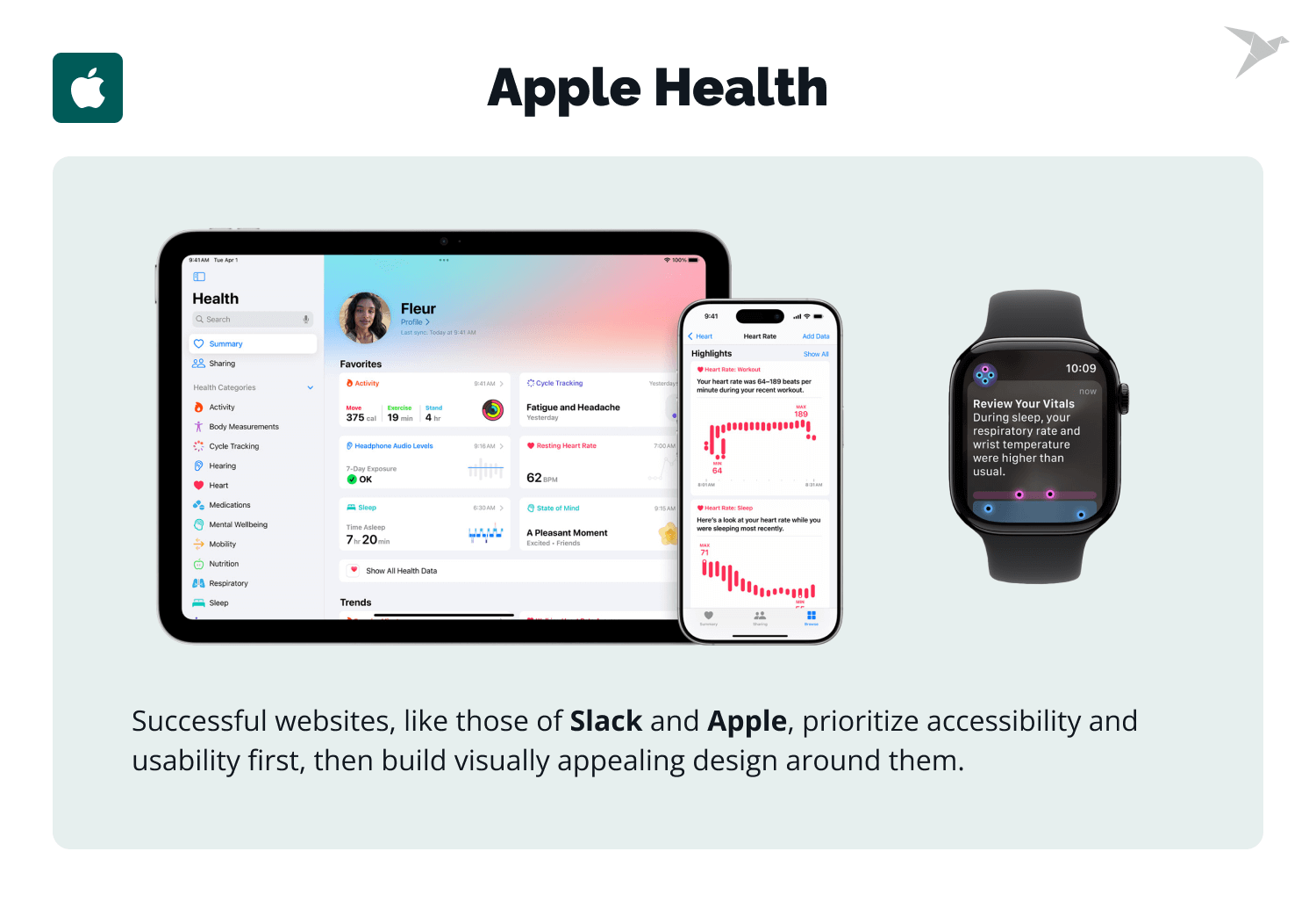 A visually appealing website won’t be useful if people can’t interact with it comfortably. It often works well to start with accessibility, build on that with usability, and then shape the visual layer around both. Companies like Slack or Apple are good examples of this approach. They’re known for visually pleasing, modern product design, but they also take accessibility seriously.