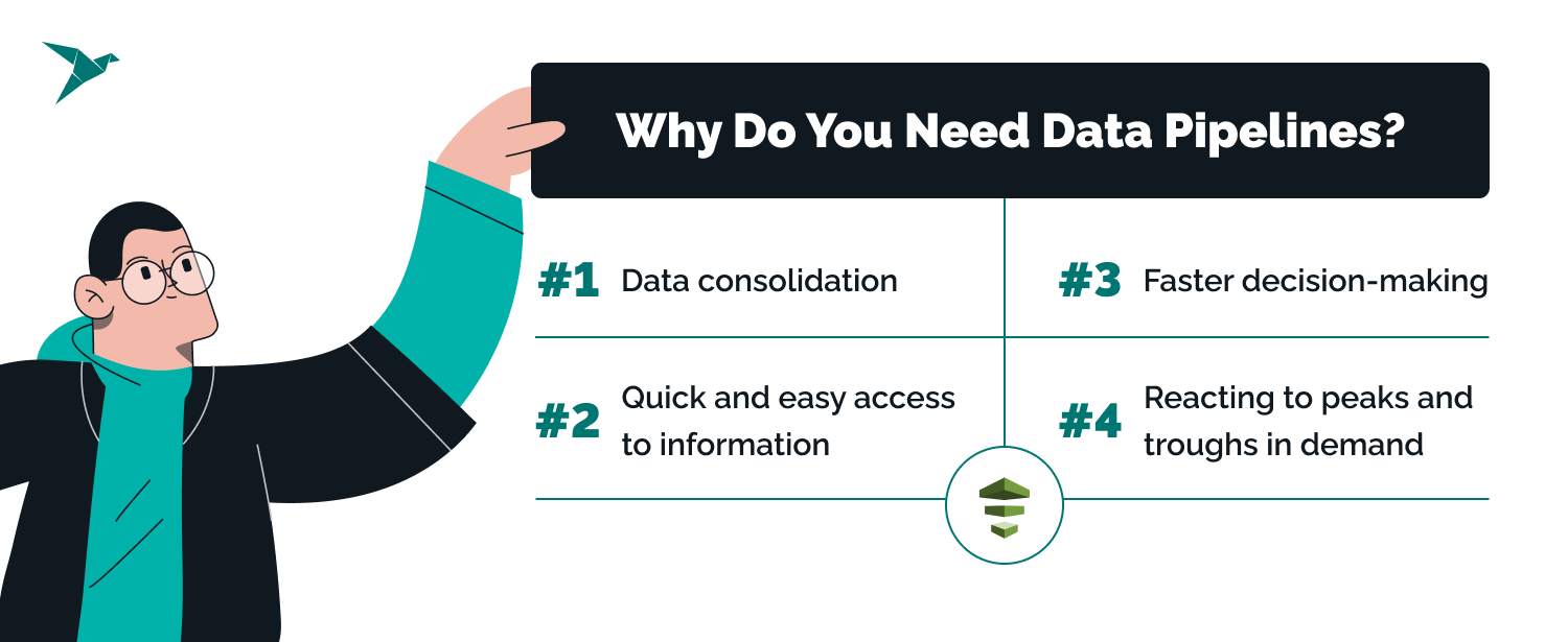 Every business will have its own industry-specific answers to that question, but here are four broad-brush applications of AWS Data Pipeline or one of the competing pipeline solutions we defined from our experience delivering data engineering services.