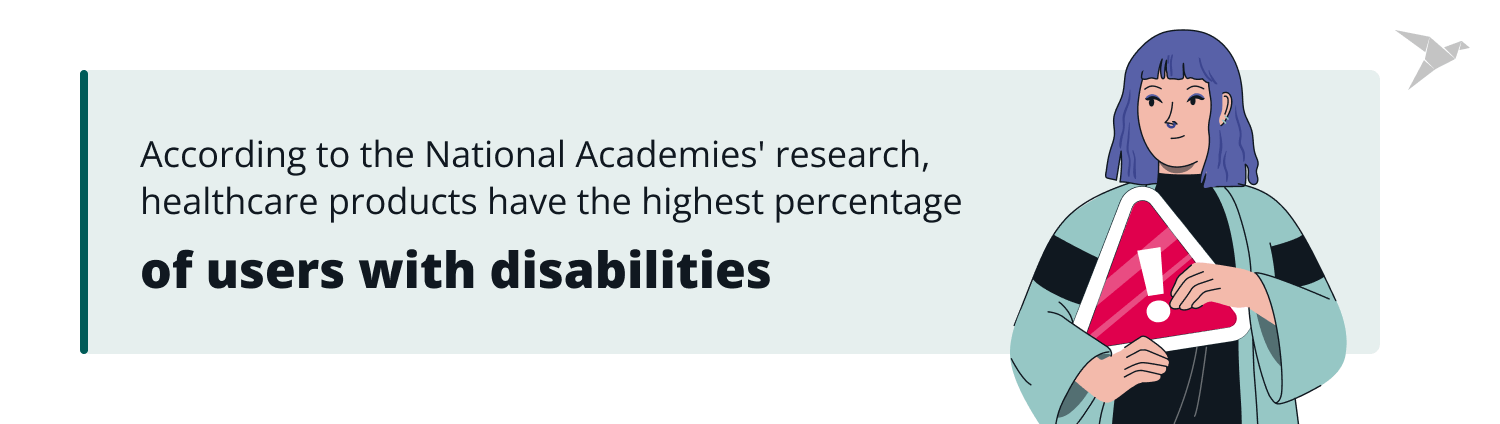 Unlike other sectors, healthcare products have the highest percentage of users with disabilities, according to research by the National Academies. That’s why accessibility in healthcare UX isn’t optional. And more than that, it demands a unique approach: professional and very careful.